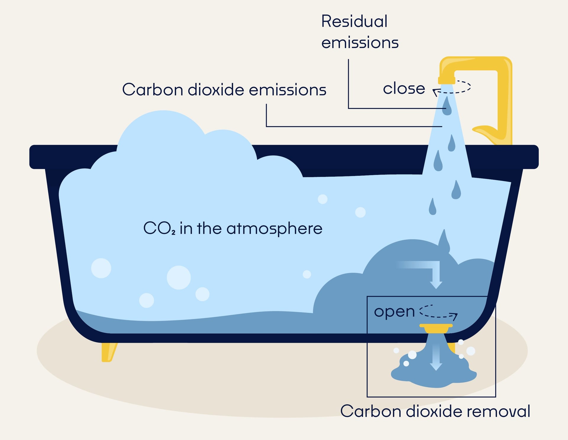 And this is where the bathtub drain comes into play: carbon dioxide removal. To ensure that the bathtub does not overflow despite the tap not being turned off, we have to let water out through the drain. Carbon dioxide removal methods allow us to reduce the concentration in the atmosphere and thus curb global warming.